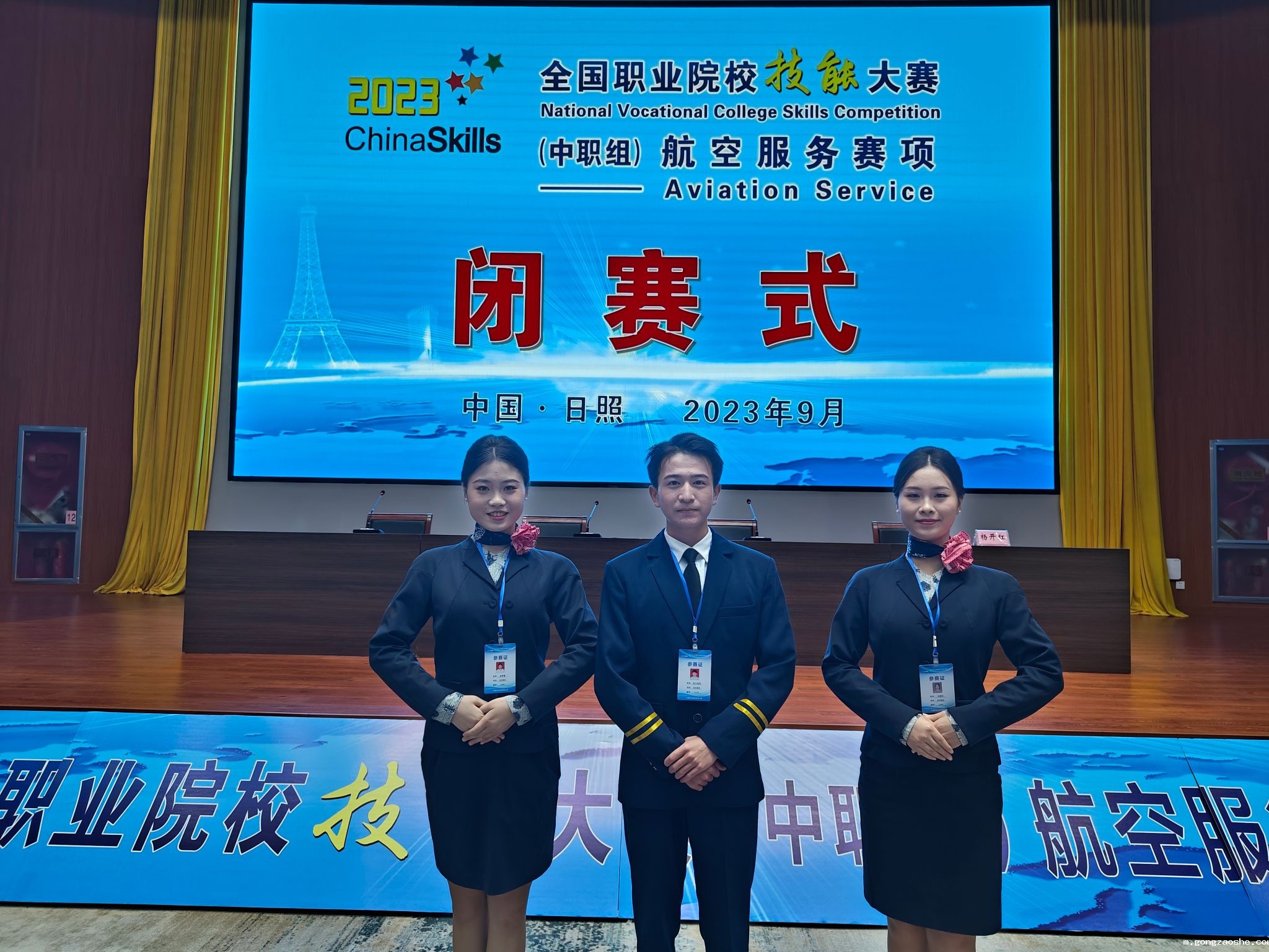 9月21日,2023年全国职业院校技能大赛(中职组)航空服务赛项在山东日照市落下帷幕。我院应用外语系航空服务专业朱兴浩冉、肖梦雅、马晓庆三位同学代表安徽省参赛荣获团体二等奖(指导教师:杨莲 唐莉)。