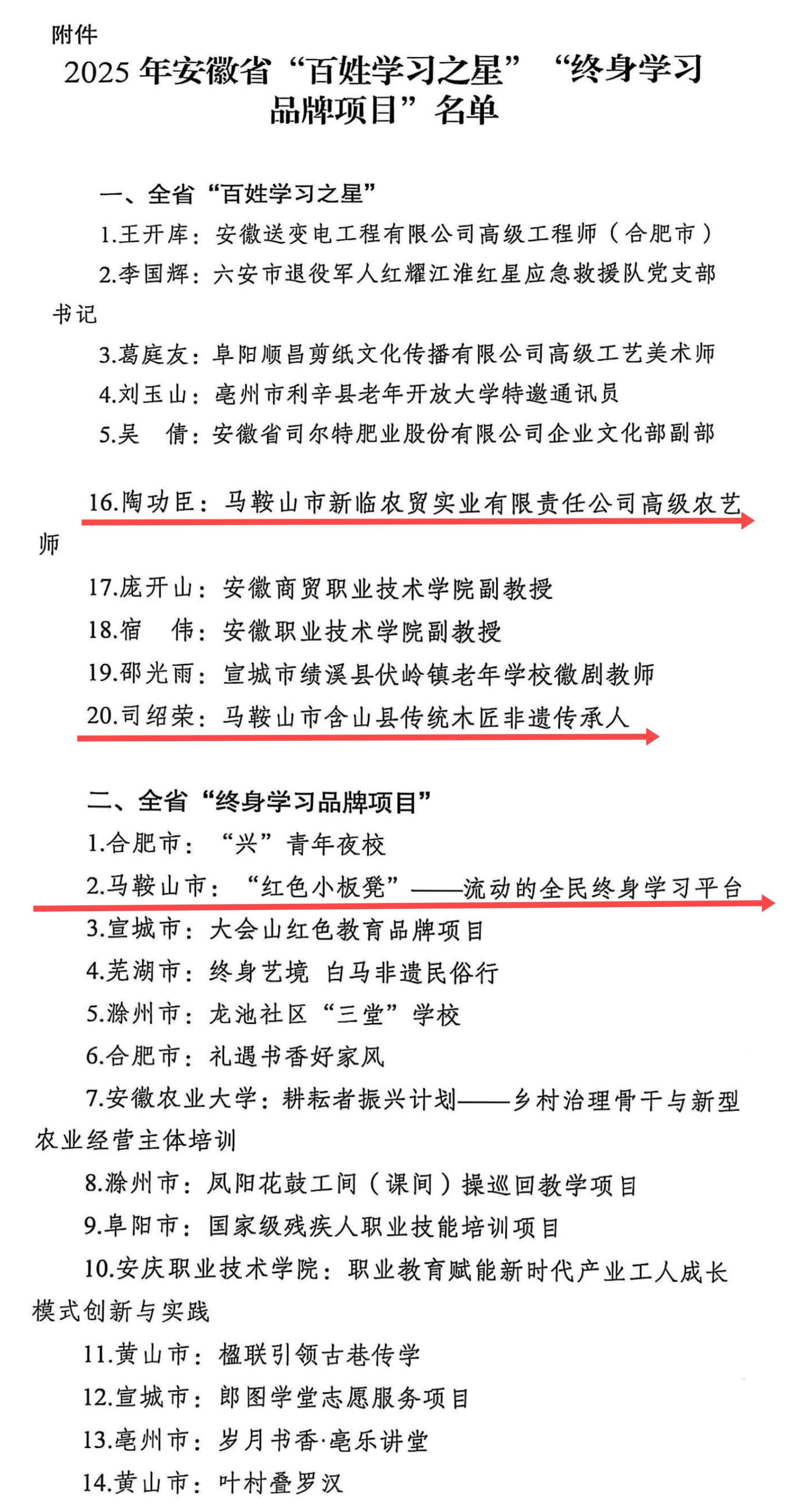 在此次遴选中,选送的博望社区学院高级农艺师陶功臣和含山社区学院传统木匠非遗传承人司绍荣两位同志入选2025年度安徽省“百姓学习之星”,含山社区学院“红色小板凳”——流动的全民终身学习平台入选安徽省2025年度”终身学习品牌项目”。据悉,“红色小板凳”将被推选参评2025年全国“终身学习品牌项目”,全省仅有5个项目获得推荐。