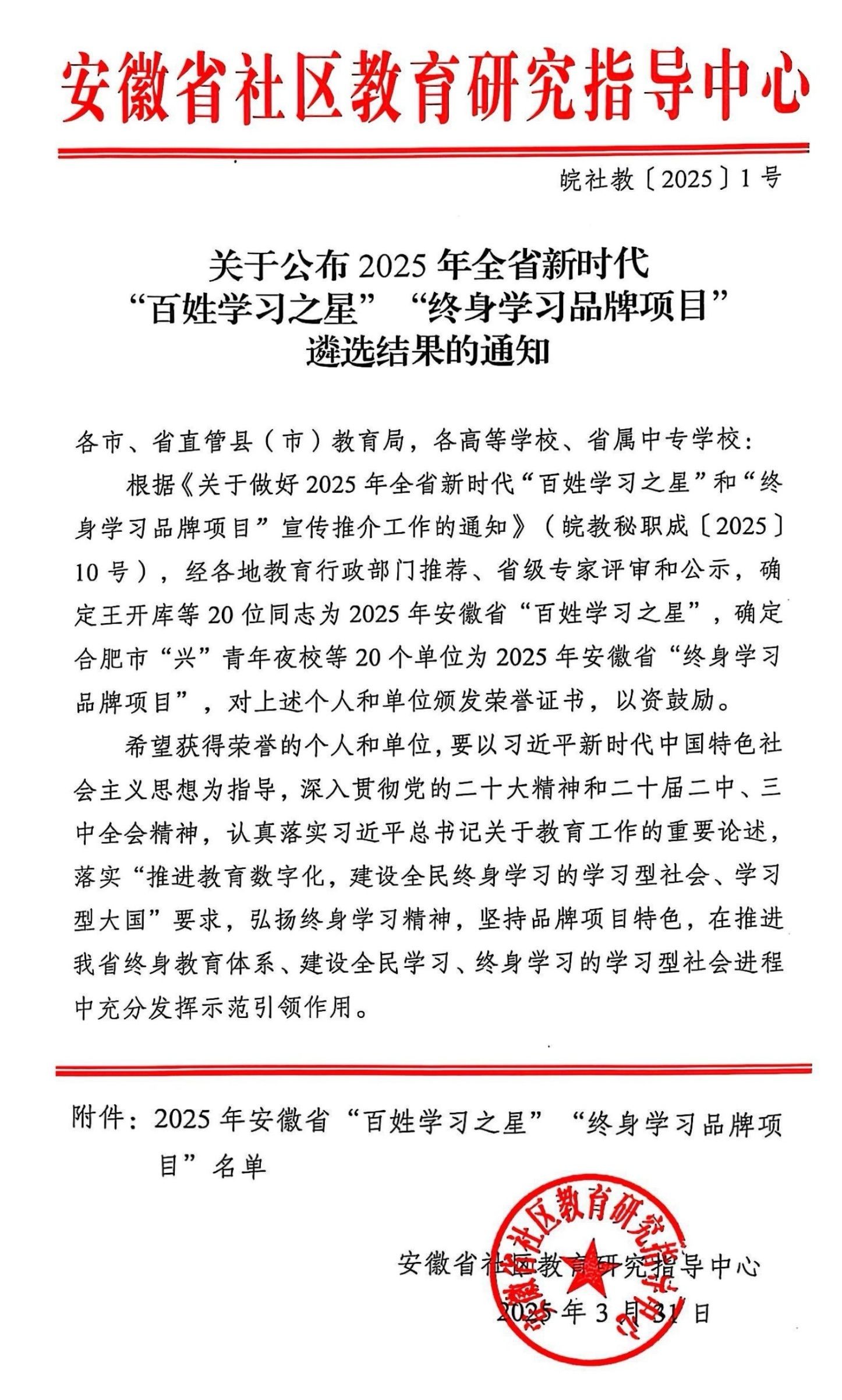 近日,2025年安徽省全民“百姓学习之星”和“终身学习品牌项目”评选结果揭晓,马鞍山市终身教育指导中心、马鞍山社区大学有2人和1个项目榜上有名,受表彰人数和入选项目位列全省前列。