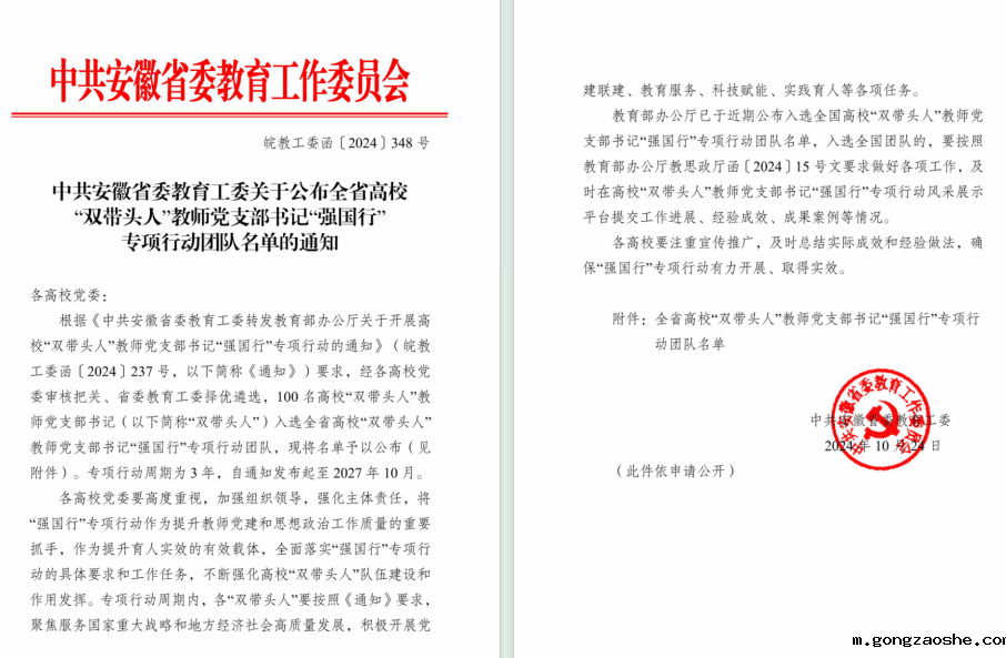 近日,安徽省委教育工委公示全省高校“双带头人”教师党支部书记“强国行”专项行动团队名单,我院电气工程系教工党支部成功入选,这是电气工程系在党建工作上的又一项成果。